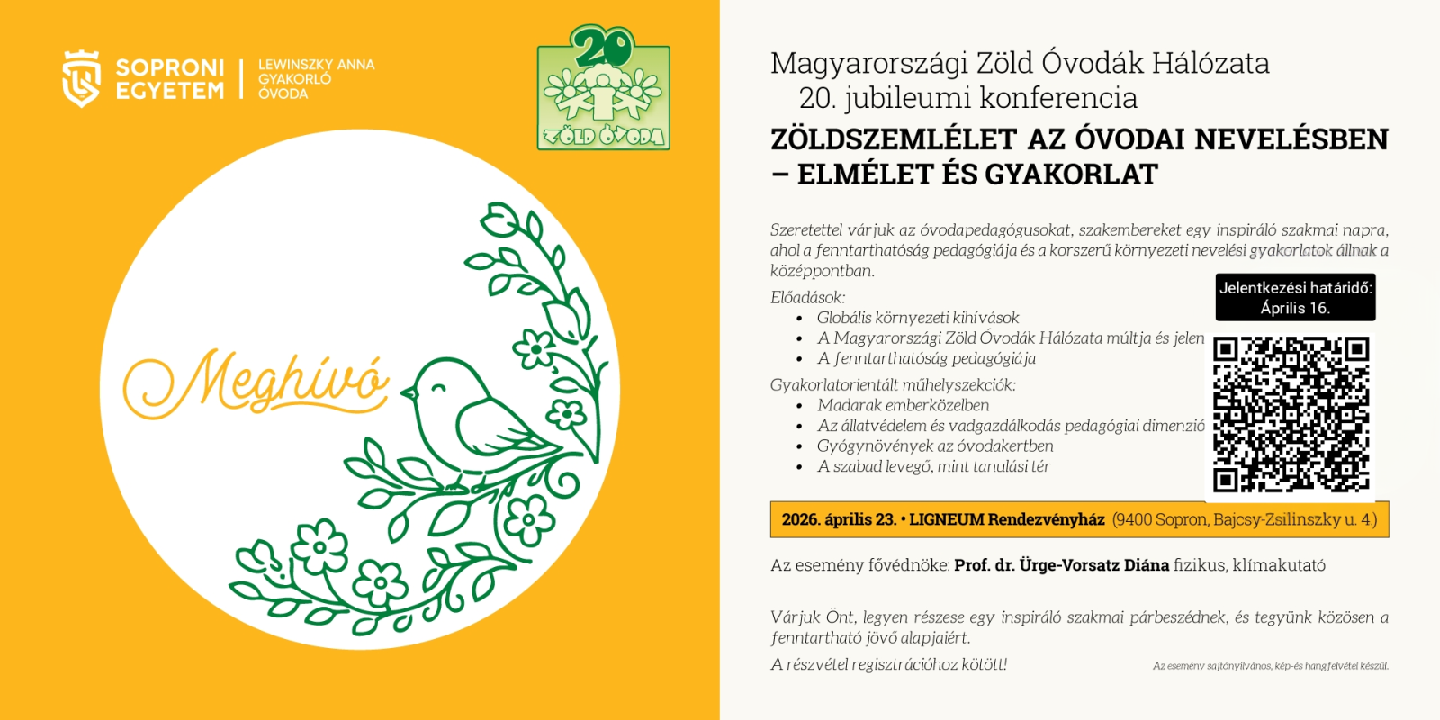 „Zöldszemlélet az óvodai nevelésben – elmélet és gyakorlat” címmel rendez konferenciát a Soproni Egyetem Lewinszky Anna Gyakorló Óvoda 2026. április 23-án, a Zöld Óvoda minősítés 20. évfordulója alkalmából. A Magyarországi Zöld Óvodák Hálózatának jubileumi konferenciája a fenntarthatóság és a környezeti felelősség kérdéskörét állítja középpontba, különös tekintettel a korai életkorban megkezdődő szemléletformálás jelentőségére.