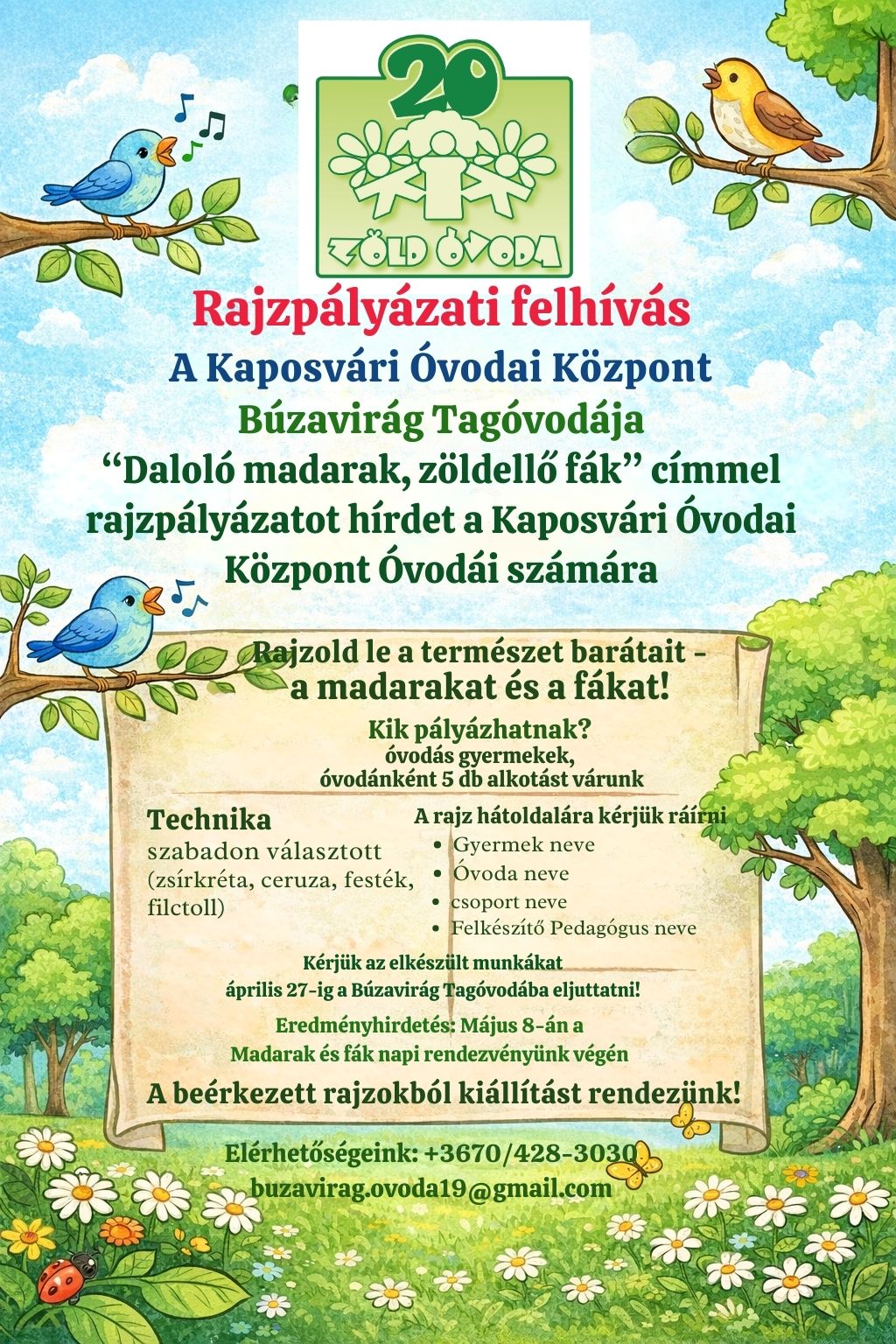 „Daloló madarak, zöldellő fák" Játékos kalandtúra a természet védelméért címmel a Kaposvári Óvodai Központ Búzavirág Tagóvodája, mint Zöld Bázisintézmény, a Madarak és fák napja alkalmából környezeti nevelési programot szervez a Kaposvári Óvodai Központ óvodái számára. A program célja, hogy felhívja a figyelmet a természet védelmének fontosságára, valamint arra, hogy az emberi tevékenység miként hat természeti és társadalmi környezetünkre.
